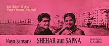 Shehar Aur Sapna (lit.'The City and the Dream') is a 1963 Hindi film directed by Khwaja Ahmad Abbas, about a young couple searching in vain for a home of their own in a metropolis, amidst the backdrop of rapidly developing city, and the many who flocked to it in hope of a better life.[1] It won the 1964 National Film Award for Best Feature Film and was nominated for Filmfare Award for Best Film.