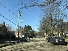 After developers acquired the land around 1911, they designed it so that the new homes would sit on large tracts of land, and they advertised the location as a "high-class" neighborhood.[5] The developers made sure to retain the large trees in the neighborhood when building the streets.[6] The developers also made sure that the land was bound by covenants prohibiting its sale to blacks and Jews.[7] The covenants stood until after World War II when the Supreme Court struck them down as unconstitutional.[7] At that point, speculators would move a black family into a house on a block that otherwise had white residents. Speculators would then tell the white residents that property values would imminently fall and pressure the white families to sell their homes to the speculators. The speculators would then sell the homes to other black families at large profits. This was called blockbusting. Starting in 1958, the Shepherd Park Citizens Association and Neighbors Inc led efforts to fight blockbusting and maintain the integrated nature of the neighborhood in the 1960s and 1970s. It is one of the only neighborhoods on the east side of Rock Creek Park where white flight was stemmed in those years.