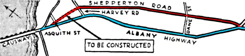 Shepperton Road was noted as running parallel to the then-named Albany Road between Harvey Street, 45 chains (3,000 ft; 910 m) from The Causeway, and Somerset Street, one and a half miles (2.4 km) further along.[1] In 1937, a road from Asquith Street to Albany Road was constructed, to eventually link in with Shepperton Road. In the same year, the intersection of Albany Road, Milford Street, and Welshpool Road was reconfigured to improve visibility, and in anticipation of an eastern extension to Shepperton Road.[2] In April 1940, that extension was nearing completion, which was expected to be by the end of May, while the demolition of houses on land resumed for the western extension was being arranged.[1] On 29 September 1941, the Perth City Council decided to construct the link between Asquith Street and Harvey Street early the following year, completing the Shepperton Road bypass.[3] Buses were rerouted onto Shepperton Road in 1946,[4] by which time it had become the preferred route for motorists.[5]