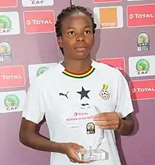 ![]() Sumaila holding the Woman of the Match award at the 2018 Women's Africa Cup of Nations following a win over Algeria on 17 November 2018 | |||