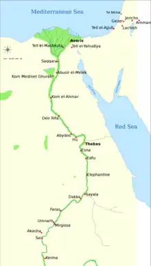 Important finds include seals from Lachish, Gezer, Jericho, Tel Michal,[20] Amman and Tell el-Ajjul[21] in Canaan. In Lower Egypt, three seals have been unearthed in Tell el-Yahudiya and Tell el-Mashkuta and a further eight are from the wider Delta region.[22] Four seals originate from Saqqara[23] and a further five from the Middle Egyptian sites of Abusir el-Melek, Kom Medinet Ghurab, Kom el-Ahmar and Deir Rifa. To the south, in Upper Egypt, a total of twenty seals are known from Abydos, Hu, Thebes, Elephantine, Esna and Edfu,[24] In Nubia, seals of Sheshi have been found in the Egyptian fortresses of Uronarti and Mirgissa and otherwise in Dakka, Kerma, Sayala, Aniba, Masmas, Faras, Ukma, Akasha and Sai.[18] Finally, two seal impressions of Sheshi have been found in Carthage,[25][26] in a context dated archeologically to the 2nd-century BC.[27]