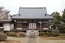 The Shimōsa Kokubun-ji (下総国分寺) is a Buddhist temple located in the city of Ichikawa, Chiba, Japan, belonging to the Shingon-shu Buzan-ha sect. The present temple is of uncertain foundation, but claims to be the direct descendant of the original Nara period provincial temple ("kokubunji") of former Shimōsa Province. which fell into ruins sometime in the Kamakura period. The Nara-period temple ruins were designated a National Historic Site in 1967, and the area under protection includes the site of a kiln used to produce roof tiles used by the temple. The area designated was expanded in 2002[1]