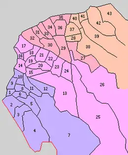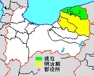 * yellow - areas formerly within the district borders during the early Meiji period