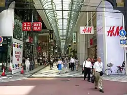 Shinsaibashi (心斎橋) is a district in the Chūō-ku ward of Osaka, Japan and the city's main shopping area. At its center is Shinsaibashi-suji (心斎橋筋), a covered shopping street, that is north of Dōtonbori and Sōemonchō, and parallel and east of Mido-suji street. Associated with Shinsaibashi, and west of Mido-suji street, is Amerika-mura, an American-themed shopping area and center of Osaka's youth culture. Major stores and boutiques concentrates are found around the area. Shinsaibashi is easily accessed via the subway.