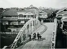 The well-used wooden bridge required considerable maintenance and repairs by the townspeople who owned it.[2] In 1873, the wooden bridge was replaced with a 37.1 metres-long and 5.2 metres-wide arched truss iron bridge that had been imported from Germany.[3] The arched bridge was considered to be quite unusual, and became a popular topic of conversation amongst Osakans.[1]