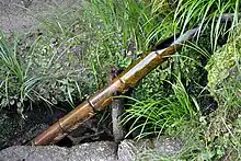 The temple's gardens are considered masterworks of Japanese gardens.[1] One of them includes a device called a sōzu, a type of shishi-odoshi designed to scare away wild animals such as deer by making a loud noise. Water trickles into a bamboo tube, and when it reaches a certain level, it upsets the balance of the tube. The tube tips over on a pivot, discharging the water, and turns upright, striking a rock and emitting a loud clapping noise. ⓘ plays a recording of the sōzu at Shisen-dō.
