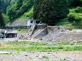 - "志津川② 南三陸町 東日本大震災 mm94" (video). YouTube.com. Archived from the original on 2021-12-13. Retrieved 2011-06-06. the destroyed railway bridge a few hundred meters northeast of Shizugawa Station, shot from a car traveling along National Route 45 38°41′30″N 141°29′21″E / 38.6917°N 141.4892°E