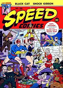 ![]() Shock Gibson with Black Cat and Captain Freedom, Speed Comics #35, November 1944, artwork by Alex Schomburg. | |
