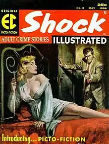 Shock Illustrated was an American black and white magazine published by EC Comics from late 1955 to early 1956. Part of EC's Picto-Fiction line, each magazine featured three to five stories.[1] The artists drew one to four panels per page with the text overlaid onto the artwork. The first issue appeared with a cover date of September–October 1955 and featured three psychology-themed stories, similar in theme to the comic Psychoanalysis published by EC in 1955. Starting with the second issue this type of story was generally reduced to one per issue, with the remaining stories being similar in theme to those that appeared in EC's comic Shock SuspenStories.[2]