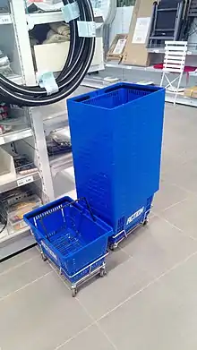 Modern shopping baskets are usually made of plastic with a handle that folds downwards so that the baskets can be stacked. Shopping baskets are usually provided at store entrances together with shopping carts, with customers returning the baskets at check-out. Many stores have small carts that stacks of baskets can be placed onto, so that many baskets can be quickly moved from the check-out to the store entrance.[2]