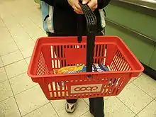 A shopping basket is a basket provided by stores for shoppers to carry around items before purchase. They are the smaller equivalent of shopping carts. Some sources also use the term shopping basket as a synonym for shopping bag, referring to bags owned by customers used to carry purchased items home.[1]