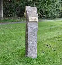 In August 2014 a monument dedicated the memory of Göthberg and Broder Daniel was put up on the site of the band's final concert. The memorial is a raised stone, weighing about 170–200 kg, carrying a plaque engraved with "Spela Shoreline". Soon afterwards, the city's Park and Nature Administration announced its intention to remove the memorial, citing it to be in violation of its rules.[6] This was met with a strong response in social media from Broder Daniel fans and others, including a number of well-known Swedes, among them the artist, songwriter and music producer Ebbot Lundberg and the journalist, voice actor and television presenter Johan Lindqvist.[7][8][9][10][11]