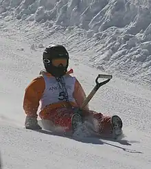 Competitive shovel racing has its roots in New Mexico's ski resorts in the 1970s. Creator Damien Deleon has been unofficially credited as the "king of shovel racing." [1] It began after ski resort workers used shovels as sleds to quickly move from one location to another.[2] The sport reached the zenith of its popularity in 1997 when it was featured in the Winter X Games, although the games organizers later removed the sport as they felt it wasn't athletic enough.[3] The most prominent competition is held in at the Angel Fire Resort in Angel Fire, New Mexico. In 2005, the resort that hosted the largest annual competition dropped the event due to liability concerns, but it resumed in 2010 after modified sleds were banned from competition. Riders often decorate their sleds with custom paint jobs. There is a wide age range in competitors, including students and retirees.[4]