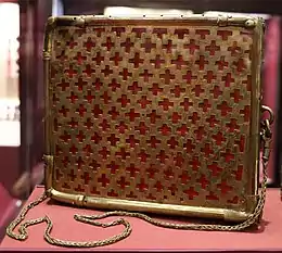 The Shrine of Miosach (also known as The Misach, Irish: Míosach[2]) is an elaborately ornamented 11th-century Irish cumdach (book shrine). It originates from Clonmany, north County Donegal, and is first mentioned in the 1165 Irish annals. It is dated to the late 11th century, when it probably contained a manuscript with psalms or extracts from a Gospel. However, the shrine was empty when first described in detail in the 18th century. It was originally associated with St Cairneach, patron saint of Dulane, County Meath,[3] but by the late medieval period had become part of the cult of the abbot and missionary Colm Cille (521-59 AD).[4]
