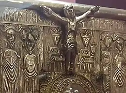 On commission from a member of the then dominant Ulster O'Domhnnaill family,[15] the shrine's front cover was added in 1534 by the goldsmith Brian O'Morrison. He signed the work with an inscription in Latin, which was translated by the Irish artist, antiquary, archaeologist and collector George Petrie as "Briain ua Muirguissan covered me, anno M.CCCCC.XXXIIII".[16] Moss believes that "covered me" should instead be read as "who enshrines me".[17] O'Morrison added twelve plates (in three arrangements of four different sizes) to the front, with depictions of saints including the crowned Virgin and Child in the smaller inner panels,[18] and St. Bridget, St. Patrick and Colm Cille in four large panels. Located in the upper center of the front cover, in the space between the plates, is a relief of the crucified Christ. The front is further decorated by eight large cabochon quartz (rock crystal) gemstones.[13] These semi-precious crystals were in vogue at the time, and probably replaced similar glass stones. Originally the stones may have acted as lapidaries, that is they were chosen and placed based on their symbolic meaning which may have tied in with the text held in the interior chamber.[19]