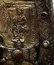 The Shrine of St Patrick's Tooth (Irish: Fiacail Phádraig, translated as Patrick's Tooth)[2] is a medieval reliquary traditionally believed to contain a tooth belonging to Patrick, Ireland's patron saint, who lived in the 5th century. The shrine comprises a wooden case lined with bronze and decorated with gold, silver and amber fittings, and was built in two phases. Its basic structure and the central ringed crosses on either side are 12th century, while the purse-shaped form and most of the metal work, including the saints, were added in the 1370s when the object was substantially refurbished.[3]