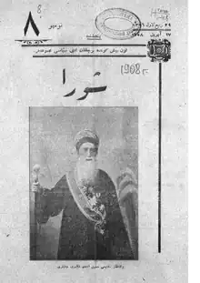 Shura was established by Muhammad Shakir and Zakir Ramiyev.[1] It was inspired from the Arabic magazine Al Manār which was edited by Rashid Rida in Cairo.[2][3] Shura was first published 10 January 1908.[1][4] It was a supplement of the daily newspaper Waqt which was in circulation between 1906 and 1918, and both publications were based in Orenburg.[2][5] Shura was published in Tatar language on a biweekly basis, on the first and fifteenth day of each month.[1][4] The editor of Shura was a reformist religious official, Rizaeddin bin Fakhreddin.[1][4] The editorial board of the magazine included Musa Jurullah Begiyev, Fatih Karimiy and Jamaliddin Validiy.[1]