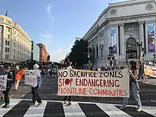 In October 2022, ShutdownDC organized a coalition of organizations for a week of actions, including street marches and a bike blockade, surrounding the annual meetings of the IMF and World Bank, under the banner "For People, For Planet: Decarbonize & Decolonize".[37] Demands included an end to fossil fuel investment by the institutions, as well as the canceling of debts held by countries in the Global South.[38]