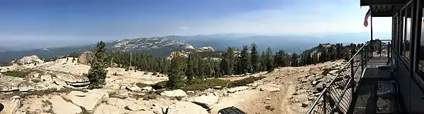 The current structure was built in 1957 featuring a 14' x 14' foot steel cab with a flat roof standing on a 10' x 10' foot concrete block base. A weather station was added in 2012.[9] Shuteye remains one of the few active lookouts in the Sierra Nevada. In 2017, Richard Bushnell, a seasonal U.S. Forest Service employee, was among the first to spot the Railroad Fire while stationed on Shuteye Peak.[10] The forest surrounding Shuteye Peak was threatened by the Creek Fire in September 2020.