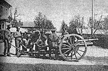 The first kurin was formed in Kyiv on 13 November 1917. Commanded by Col. Yevhen Konovalets with his chief of staff Andriy Melnyk, the Sich Rifles had up to 25,000 men at their peak, including artillery, cavalry, reconnaissance and machine-gun units.The Sich Riflemen defended the government of UNR against the Bolshevik insurrection in the capital and later against regular Red Army forces that advanced into Ukraine in 1918. When Kyiv was recaptured in March 1918 the Ukrainian Sich Riflemen guarded government buildings in the capital and maintained order in the city. The unit later expanded to include two infantry detachments, a cavalry unit and an artillery battery. With the establishment of the Hetmanate of Pavlo Skoropadsky, the Sich Riflemen refused to serve him and were disarmed by the German forces that supported the hetman.