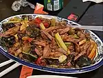 Abundant rice and vegetables are produced from the fertile Sichuan Basin, whereas a wide variety of herbs, mushrooms and other fungi prosper in the highland regions. Pork is overwhelmingly the most common type of meat consumed.[3] Beef is somewhat more common in Sichuan cuisine than it is in other Chinese cuisines, perhaps due to the prevalence of oxen in the region.[6] Sichuan cuisine also uses various bovine and porcine organs as ingredients, such as intestine, arteries, head, tongue, skin and liver, in addition to other commonly used portions of the meat. Rabbit meat is also much more popular in Sichuan than elsewhere in China. It is estimated that the Sichuan Basin and Chongqing area are responsible for about 70 percent of China's total rabbit meat consumption.[7] Yoghurt, which probably spread from India through Tibet in medieval times, is consumed among the Han Chinese. This is an unusual custom in other parts of the country. The salt produced from Sichuan salt springs and wells, unlike sea salt, does not contain iodine, which led to goiter problems before the 20th century.[3]