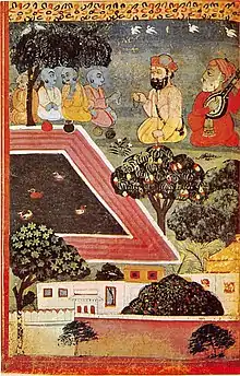 ![]() Depiction of Guru Nanak and Mardana in-dialogue with Siddhas in Achal Batala. Painting is from the B-40 Janamsakhi manuscript completed in 1733. | |