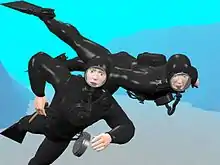 Computer-generated image of three frogmen riding a Subskimmer underwater. Their breathing sets are the Siebe Gorman CDBA.