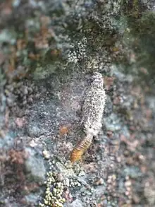 The wingspan is 14โ15 mm. The forewings are shining brownish-grey with white markings. The hindwings are grey.[2]