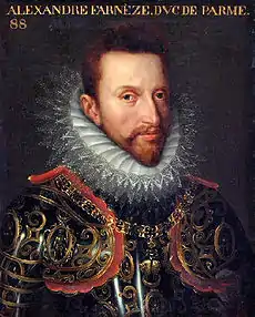 Meanwhile, the Prince of Parma, Governor-General of the Low Countries in the name of Philip II of Spain, in command of an army of 60,000 soldiers, divided in various fronts, after the Spanish conquests of Maastricht, 's-Hertogenbosch, Courtrai, Breda, Tournai, Oudenaarde, among others, between 1579 and 1582, slowed his successful campaign for the moment, waiting to see what the French would do.[5][14]