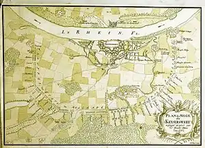 The siege of Kaiserswerth (18 April – 15 June 1702), was a siege of the War of the Spanish Succession. Prussian and Dutch troops numbering 38,000 men and 215 artillery pieces and mortars under the command of Imperial Field Marshal Walrad, Prince of Nassau-Usingen, besieged and captured the small French fortress on the Lower Rhine, which the French had occupied without resistance the previous year. The Dutch regarded the capture of this fortification as more important than an advance into the French-held Spanish Netherlands.[1]