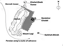 Nader initially tried to dissuade the mullah from taking part in the attack given the threat he faced but Adineh insisted on taking part.[2] The night before the attack, Nader personally addressed the Bakhtiaris and told them that they would each be given 1,000 rupees and a share of the spoils of the city if the assault succeeded.[2] On March 24, the assault commenced and the Bakhtiaris surged forth from their concealed positions on the cliffs of Chehel Zina and charged towards the city. The Afghan gunners in the fortified city guard towers managed to kill some of the attackers but many of the Bakhtiaris reached the city walls and used their ladders to scale it. Mullah Adineh was the first to make it to the top and a fierce struggle took place atop the Kandahar city walls.[2] Gradually, the Bakhtiaris managed to take control of the walls and proceeded to take the inner fortifications of the city. The attackers then raised guns atop the walls and used them to bombard the city.