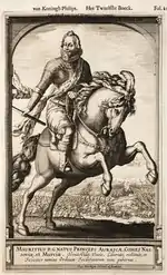 The siege of Knodsenburg, Relief of Knodzenburg or also known as Battle of the Betuwe was a military action that took place during the Eighty Years' War and the Anglo–Spanish War at a sconce known as Knodsenburg in the district of Nijmegen.[7] A siege by a Spanish army under the command of the Duke of Parma took place from 15 to 25 July 1591. The fort was defended by the Dutch Republic's commander Gerrit de Jong and his company which was then subsequently relieved through the intervention of a Dutch and English army led by Maurice of Orange and Francis Vere respectively on 25 July.[8] As a result, the Spanish army was defeated and Parma managed to retreat by getting his army across the River Waal.[3][9]
