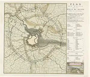 Menin had been occupied by the French since 1678 and turned into a formidable fortress by Vauban. The fortress was manned by some 5,000 French soldiers under command of general de Caraman and military governor Louis d'Etendart, Marquis de Bully.[3]