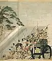 The siege of the Sanjō Palace was the primary battle of the Heiji Rebellion (平治の乱, Heiji no ran, January 19 – February 5, 1160) during the late Heian period of Japan .[1] The conflict arose from feud between court advisors Fujiwara no Nobuyori and Fujiwara no Michinori, both of the powerful Fujiwara clan, with each respectively allied alongside the warrior clans of the Minamoto (Genji) and Taira (Heiki).[2] The Siege is the focal point of the Japanese war epic (軍記物語, Gunki monogatari) The Tale of Heiji (平治物語, Heiji monogatari) and the corresponding Illustrated Scrolls of the Tales of the Heiji (平治物語絵巻, Heiji monogatari emaki).[3] The Night Attack on Sanjō Palace (Sanjō-den yo-uchi no maki) handscroll is the most prominent of the three extant Illustrated Scrolls and belongs to The Museum of Fine Arts, Boston, in Boston, Massachusetts, where it currently resides on display.[4][2]