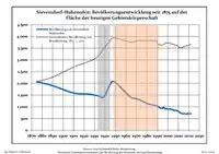 Development of population since 1875 within the current boundaries (Blue line: Population; Dotted line: Comparison to population development of Brandenburg state; Grey background: Time of Nazi rule; Red background: Time of communist rule)