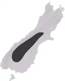 Sigaus australis can be found in the southern half of the South Island, from Otago and Canterbury regions. It can be found as far south as the Takitimu Mountains[6] and as far north as the Torless Range (43°14′39″S 171°48′34″E / 43.244052°S 171.809578°E). Sigaus australis prefer tussock grasslands between 1,300–1,700 metres (4,300–5,600 ft) elevation, however, can be found as low as 200 metres (660 ft) on the Alexandra Tailings, (45°14′49″S 169°22′07″E / 45.246895°S 169.368559°E)[7] and as high as 2,000 metres (6,600 ft) on Smite Peak (43°21′10″S 171°14′17″E / 43.35276073°S 171.2380887°E). Evidence from mtDNA sequencing suggests that S. australis encompasses several narrow endemic taxa and one widespread species.[7]Sigaus australis would have been more widespread during the last glacial period with both morphological and genetic signature of greater population connectivity in the past.[6] With climate warming and low dispersal potential, S. australis will probably lose 75% to 93% of its suitable habitat by 2070.[8]