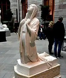 From 1896, she was awarded various scholarships which allowed her to continue her studies. During her final year at the Academy, she was awarded the Royal Medal for her figurines Kristus and Maria (Christ and Mary), part of a series of five she was creating for Oskarshamn Church (completed in 1899).[5] In 1898, she used plaster to create a model for her most famous piece, Bebådelsen, which was initially displayed at the Academy. The final version in marble was created in Italy under Blomberg's supervision and was acquired by the National Museum in 1900. Depicting the Virgin Mary kneeling in prayer, it was greatly appreciated by visitors to the museum and was later mass-produced in terracotta miniatures which became popular in Swedish homes.[1]