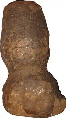 The pewter vessel, when reconstructed, turned out to be "a simple, biconical flagon similar to a few other examples found in southern Britain which can be dated broadly to the fourth and no earlier than the late third century."[1] The most recent version of the translation on the stone is "[The something] of Tebicatus, son of the tribe of N”. The missing word may be "memorial" or, less probably, "land", if the stone were a territorial marker rather than a grave marker. J. A. Baird argues that both archaeological and linguistic evidence suggest that the stone belongs to "the earliest phases of the ogham script", which emerges with contact between late Roman Latin and Old Irish.[3]
