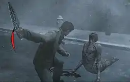 In addition to exploration, combat is another major element to the gameplay, and the player must fight the various monsters that appear. In contrast to the more naïve everyman protagonists of previous games, combat in Homecoming takes into account Alex's experience as a soldier.[9] The player is able to perform light and heavy attacks, or mix them to perform combinations,[12] and may also perform a variety of finishing moves to ensure that the monsters are dead, a gameplay mechanic first featured in a rudimentary form in Silent Hill: Origins.[12] Attacking enemies also leaves wounds in them that match the motion carried out by Alex in inflicting the attack.[13] In terms of controlling Alex, the player may also perform new maneuvers such as targeting the enemy before attacking them, dodging enemy attacks, and performing counter-attacks.[10] As well as melee weapons, pistols, rifles and shotguns are available as firearms, which can be upgraded to stronger versions later in the game: firearm handling is also rendered in a more realistic manner, with Alex having to shoulder long guns and suffering aim effects like recoil.[11] In addition to the changes in combat, and unlike previous entries in the series, the player is also able to fully control and rotate the camera as they choose;[9] one analog stick controls player movement, and the other controls the camera.