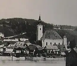 The Catholic Nikolauskirche was damaged several times in the 1890s by flooding of the Salzach river, especially by the 1899 flood that severely impacted the Altach district and destroyed a large part of the town. This led to the decision that the whole of Oberndorf, including the parish church of St. Nicholas, would need to be rebuilt about 800 meters (0.5 mile) upstream.[3]
