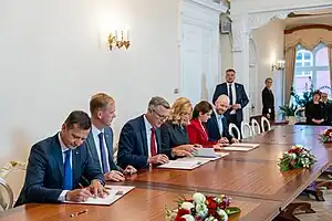 - ↑ "«Jaunā Vienotība», ZZS un «Progresīvie» paraksta koalīcijas līgumu un valdības deklarāciju". www.lsm.lv (in Latvian). Retrieved 2023-09-15.