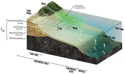 The diagram on low-temperature processes shows how these can control the dissolution of (either amorphous or crystallized) siliceous minerals in seawater in and to the coastal zone and in the deep ocean, feeding submarine groundwater (FGW) and dissolved silicon in seawater and sediments (FW).[1] These processes correspond to both low and medium energy flux dissipated per volume of a given siliceous particle in the coastal zone, in the continental margins, and in the abysses and to high-energy flux dissipated in the surf zone.[1]