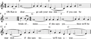 In "Silver Dagger", the female narrator turns away a potential suitor, as her mother has warned her to avoid the advances of men in an attempt to spare her daughter the heartbreak that she herself has endured. The 1960 recording by Joan Baez features only a fragment of the full ballad.[4] "Katy Dear" uses the same melody but different lyrics, telling a similar story from a male perspective.[5]