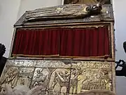 Sometime between AD 565 and 578, a body believed to be that of Simeon was translated from Syria or Jerusalem to Constantinople.[9] Sometime around the Siege of Constantinople (1203) the relics were seized and shipped to Venice; however, a storm forced the ship to put in to the port of Zadar on the Dalmatian coast. The relics were first placed in the Velika Gospa (Church of the Virgin) and then later translated to the Church of St. Stephen, which became known as the Sanctuary of St. Simeon the Godbearer. Simeon is one of the four patron saints of Zadar; his feast day is celebrated on 8 October. In October 2010, Archbishop Želimir Puljić of Zadar conveyed a small silver reliquary containing some of Simeon's relics to Archbishop Theofylactus of Jordan, representing Theophilos III, the Greek Orthodox Patriarch of Jerusalem, for the monastery of St. Simeon the Godbearer in Jerusalem.[10]