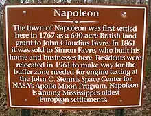 One of Favre's properties on the Pearl River was originally settled by his father in 1767, and was inherited by Favre upon his father's death in 1782. This plantation later became known as the town of Napoleon, and Favre kept a store there that later became a part of the community's church.[5] In 1961 all the residents of the town were moved when the property was declared within the buffer zone of the John C. Stennis Space Center. Another one of his Pearl River properties became the town of Pearlington, Mississippi, where many of his children, including those of his Choctaw mistress, lived.[5]