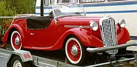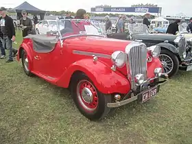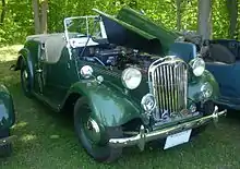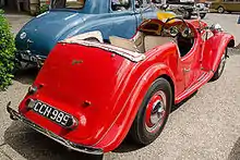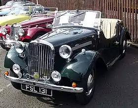 The successful Roadster re-appeared following the war, in 1946, with these modifications: non-lubricated rubber shackle bushes, improved seating accommodation provided by moving the engine forward and an improved lid at the rear of the body providing a flat platform for luggage.[7] These changes seem to have improved the handling.[5] Better engine mounts and other isolations were introduced, providing a smoother ride and lessening maintenance. Cars began to filter out to the dealers in September 1946.[8] Nearly all post war production was exported the car being popular with the Elite in India and featured in the collections of a few Maharaja's.