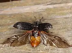 The beetles reach a body length of 12 to 16 millimeters and have a very shiny, black body, sometimes with turquoise sheen.[6] Despite being in the family Lucanidae (stag beetles), they look rather like true rhinoceros beetles, which are well known for their rhinoceros-like horn. The body is cylindrical and the elytra and thorax have distinct rows of pits and grooves.[7] The males have a well-developed horn on their heads, which is significantly smaller in the females. In addition, the cavities on the pronotum in the female are much shallower than the distinct cavities in the male. The larvae are white and soft with brown heads.[6]