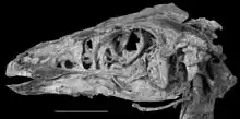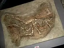The herbivory of this genus is supported by the rare presence of gastroliths, as such stones were found forming conspicuous masses in the stomach areas of the fossil skeletons.[7] This species was gregarious, which is corroborated by the arrangement of the fossil remains in a small bonebed with the juvenile individuals being approximately of the same age. This is furthermore supported by the increase of running ability as the animal progressed in its ontogeny, thus shown in the more cursorial proportions of the adults which possess relatively longer lower legs. It was assumed by the describers that adults protected themselves and their juveniles from predators by forming familial groups; in 2008 however a study concluded that the all juvenile herds suggest that immature individuals were left to fend for themselves in juvenile groups while adults preoccupied themselves with nesting or brooding.[2][3]