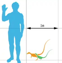 Sinosauropteryx was a small bipedal theropod, noted for its short arms, large first finger (thumbs), and long tail. The taxon includes some of the smallest known adult non-avian theropod specimens, with the holotype specimen measuring only 68 cm (27 in) in length, including the tail.[1][2] However, this individual was relatively young.[3] The longest known specimen reaches up to 1.07 m (3.5 ft) in length, with an estimated weight of 0.55 kg (1.2 lb).[4] A subsequent paper estimated it mass to be 0.99 kg (2.2 lb).[5]
