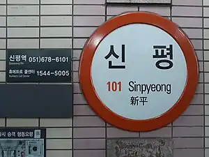 Sinpyeong Station is a station of Busan Metro Line 1 located in Sinpyeong-dong, Saha District, Busan, South Korea.